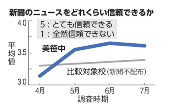 その結果、新聞のニュースはどれくらい信頼できるか5段階で答える質問では、美笹中は4月は平均3.14だったが、7月には3.61と大きく上がった。一方、新聞を配らなかった学校は4月は3.3、7月は3.39と、あまり変わらなかった。