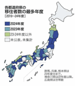 そこ で、各都道府県の資料や担当部署への聞き取りで移住状況を調べた。未集計や未公表を除く府県を対象に、近年の移住者数の推移を地図で示した。2019年度以降6年間で移住者数が最多だったのは、24年度が長野、静岡、滋賀、福井、三重など17県、23年度が群馬、岐阜、富山など13県の計30県。新型コロナウイルス禍の収束以降、再び首都圏への転入が進む一方で、全国的に地方回帰の流れが起きていることが分かった。