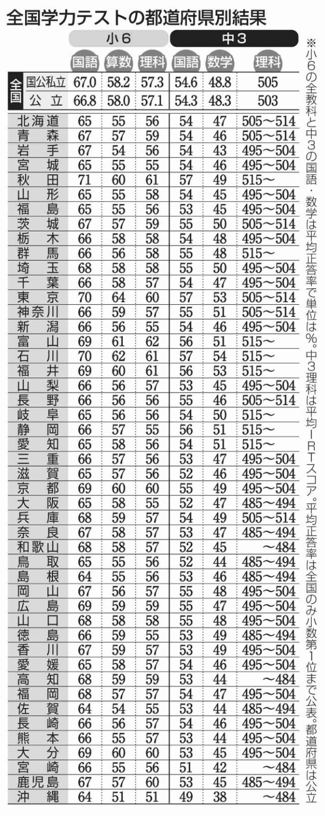 全国学力テストの都道府県結果 秋田や石川が上位に 都道府県別公表