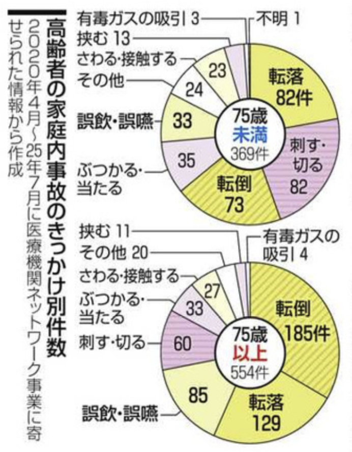 センターによると、20年4月〜25年7月の約5年間の65歳以上の高齢者の家庭内事故は923件。